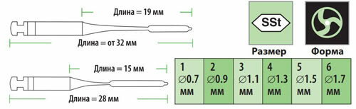 - Выпускаются в шести размерах диаметром от 0,7 до 1,7мм. Общая рабочая длина инструмента (режущая часть + стержень) составляет 15 - 19мм.