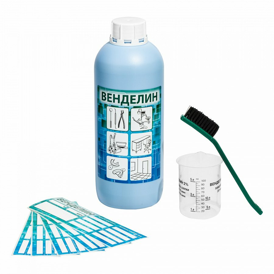 • комплект (флакон 1 л; мерный стакан, 100 мл; многоразовая щетка для очистки инструментов; наклейки для контейнера с дезинфицирующим раствором)